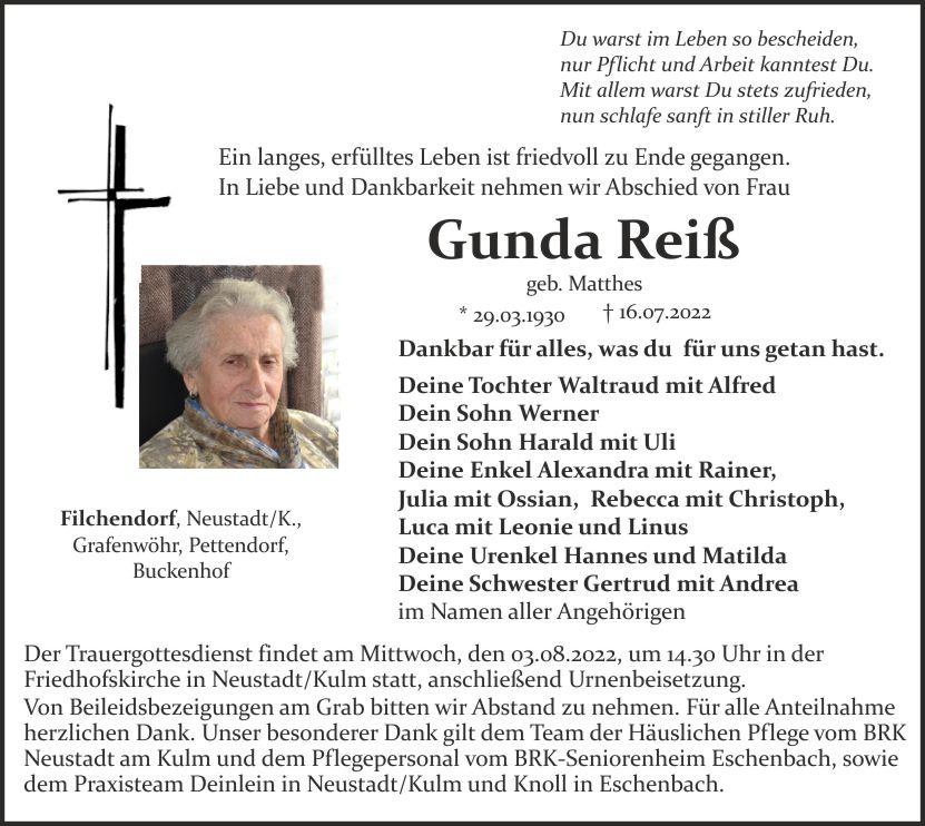 Der Trauergottesdienst findet am Mittwoch, den 03.08.2022, um 14.30 Uhr in der Friedhofskirche in Neustadt/Kulm statt, anschließend Urnenbeisetzung.