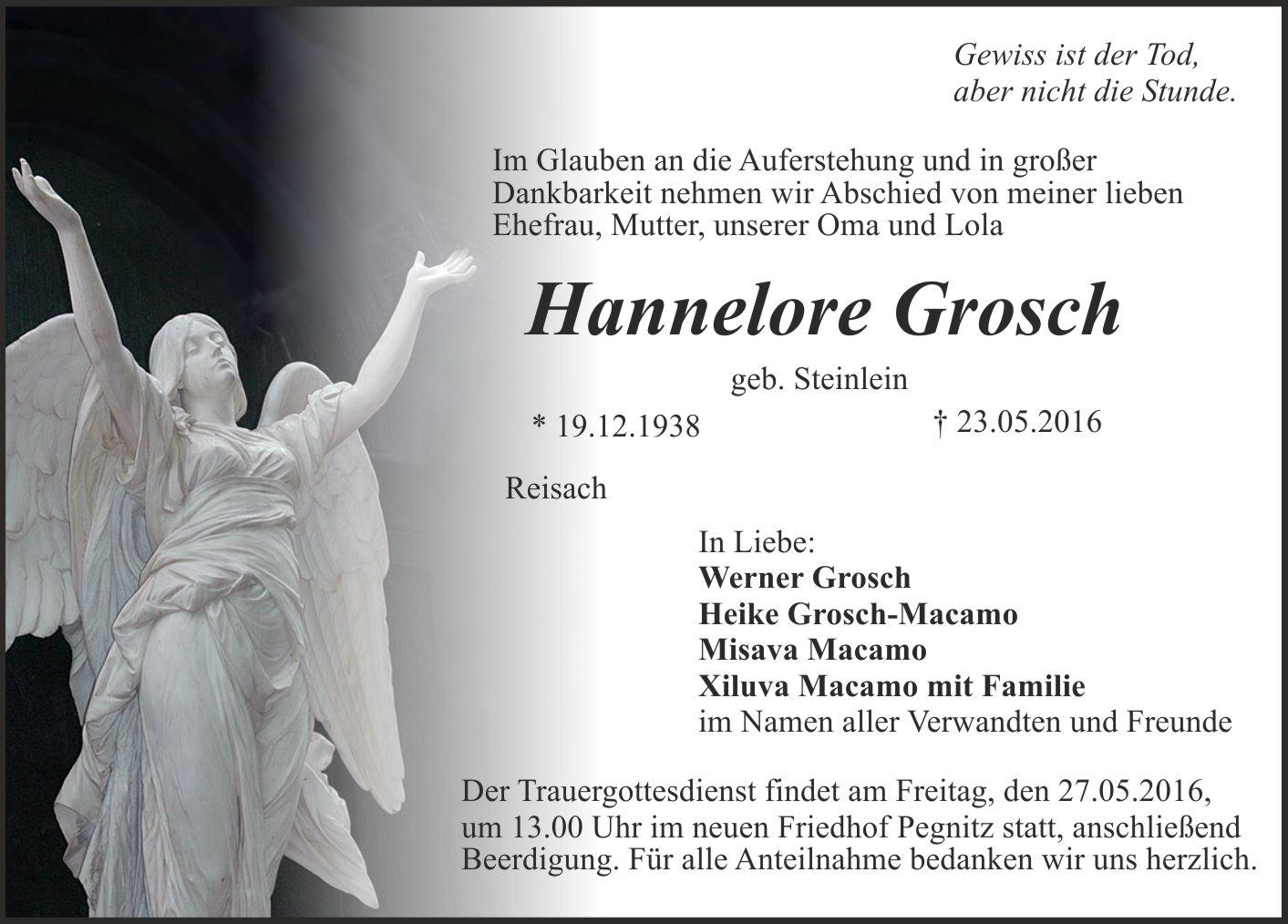 Der Trauergottesdienst findet am Freitag, den 27.05.2016, um 13.00 Uhr im neuen Friedhof Pegnitz statt, anschließend Beerdigung. Für alle Anteilnahme bedanken wir uns herzlich.