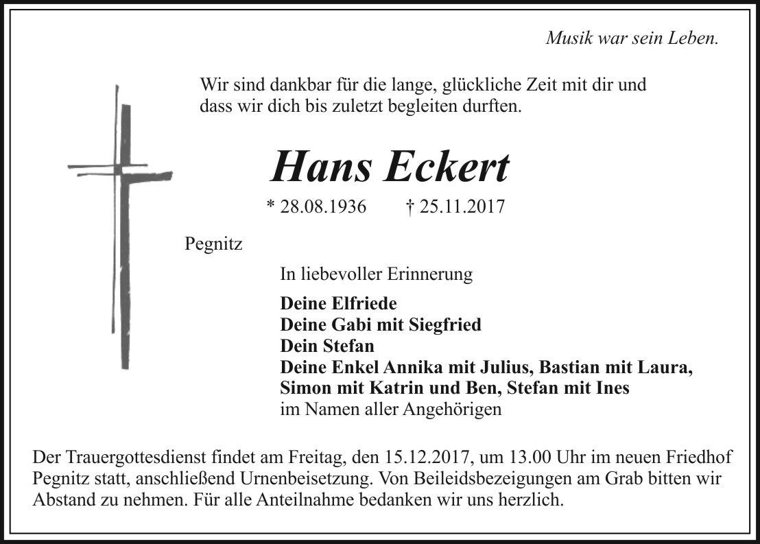 Der Trauergottesdienst findet am Freitag, den 15.12.2017, um 13.00 Uhr im neuen Friedhof Pegnitz statt, anschließend Urnenbeisetzung. Von Beileidsbezeigungen am Grab bitten wir Abstand zu nehmen. Für alle Anteilnahme bedanken wir uns herzlich.