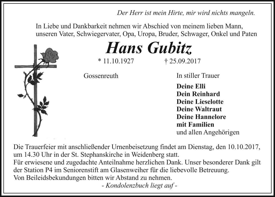 Die Trauerfeier mit anschließender Urnenbeisetzung findet am Dienstag, den 10.10.2017,