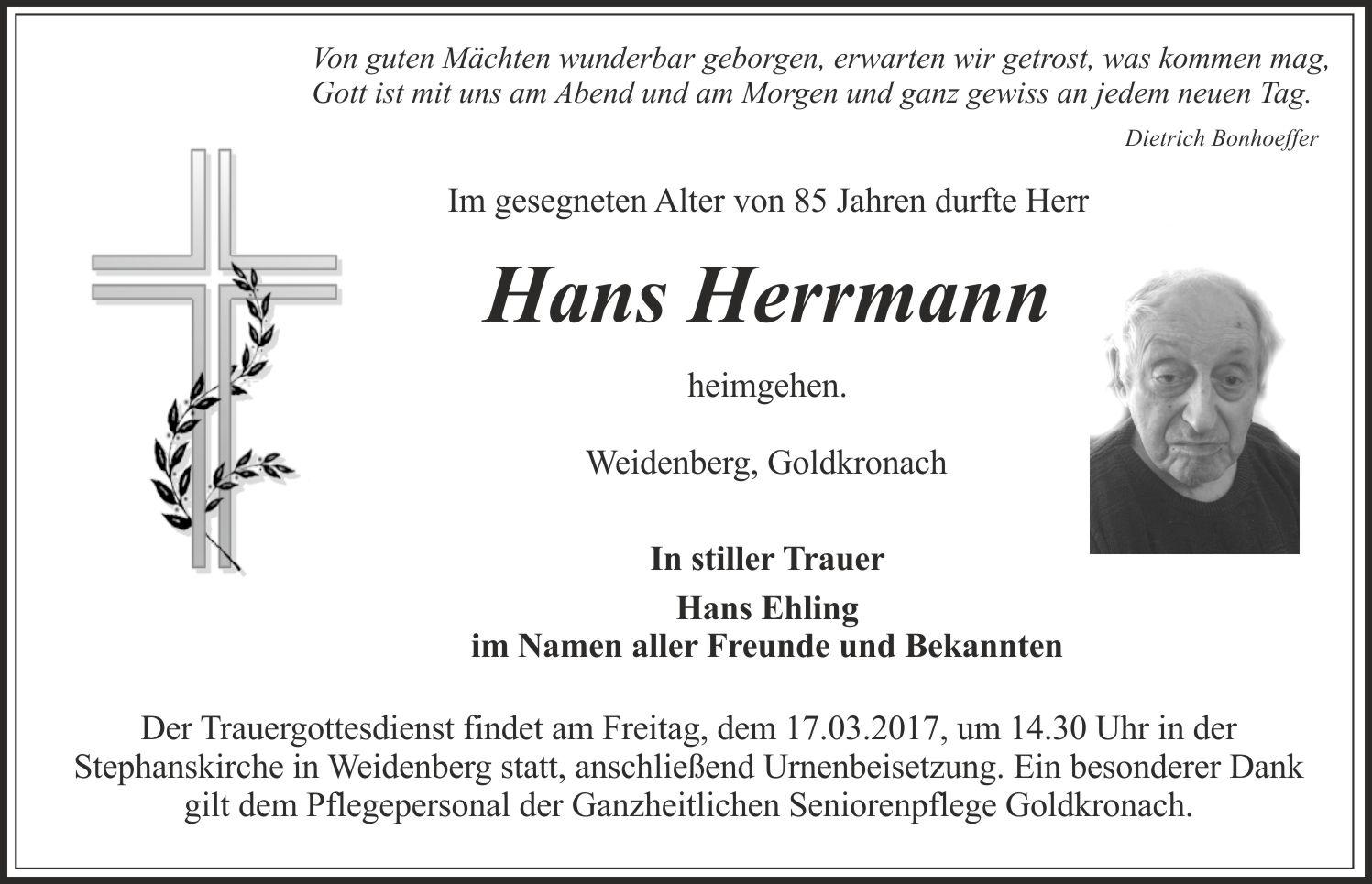 Der Trauergottesdienst findet am Freitag, den 17.03.2017, um 14.30 Uhr in der Stephanskirche in Weidenberg statt, anschließend Urnenbeisetzung.