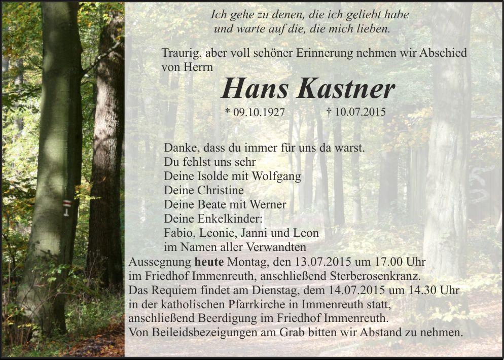 Aussegnung Montag, 13.07.2015 um 17.00 Uhr im Friedhof Immenreuth, anschließend Sterberosenkranz. Requiem am Dienstag, den 14.07.2015 um 14.30 Uhr in der katholischen Pfarrkirche Immenreuth, anschließend Beerdigung im Friedhof. Von Beileidsbezeigungen am Grab bitten wir Abstand zu nehmen.
