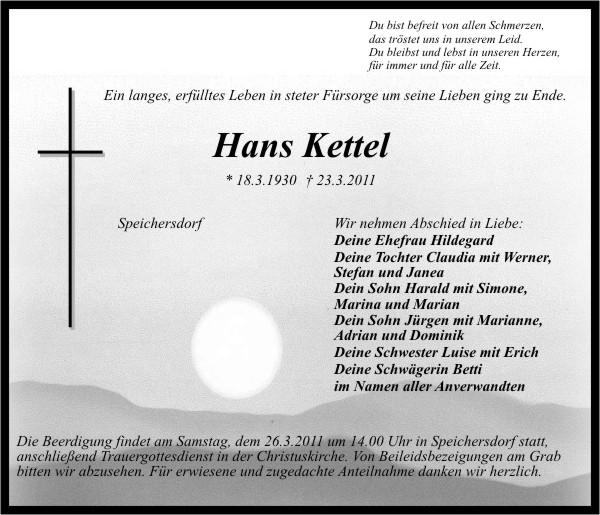 Die Beisetzung findet am Samstag, 26.03.2011 um 14:00 Uhr auf dem Friedhof in Speichersdorf statt.