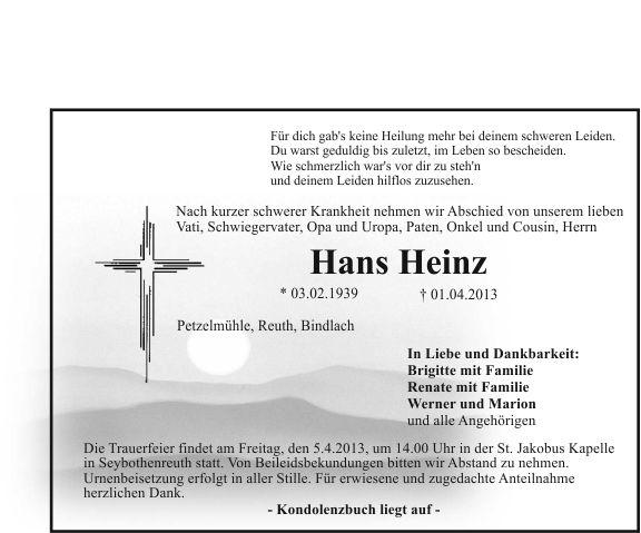 Die Trauerfeier findet am Freitag, den 5.4.2013 um 14.00 Uhr in der Kapelle in Seybothenreuth statt. Von Beileidsbekundungen bitten wir Abstand zu nehmen. Urnenbeisetzung erfolgt in aller Stille. Für erwiesene und zugedachte Anteilnahme herzlichen Dank.