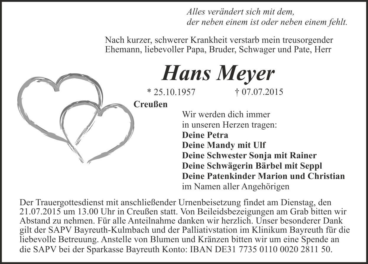 Der Trauergottesdienst mit anschließender Urnenbeisetzung findet am Dienstag, den 21.07.2015 um 13.00 Uhr in Creußen statt. Von Beileidsbezeigungen am Grab bitten wir Abstand zu nehmen. Für alle Anteilnahme danken wir herzlich. Unser besonderer Dank gilt der SAPV Bayreuth-Kulmbach und der Palliativstation im Klinikum Bayreuth für die liebevolle Betreuung. Anstelle von Blumen und Kränzen bitten wir um eine Spende an