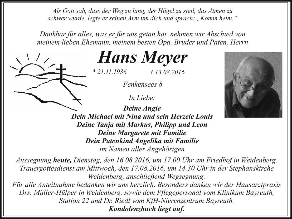 Aussegnung heute, Dienstag, den 16.08.2016, um 17.00 Uhr am Friedhof in Weidenberg. Trauergottesdienst am Mittwoch, den 17.08.2016, um 14.30 Uhr in der Stephanskirche Weidenberg, anschließend Wegsegnung.