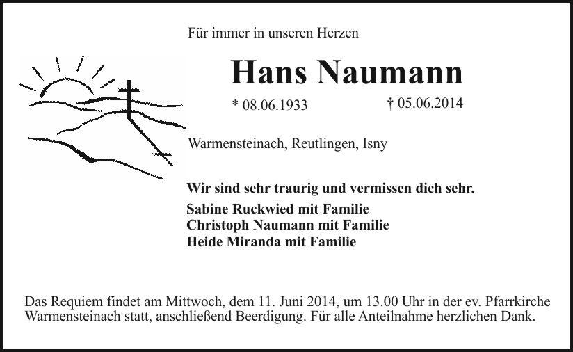 Das Requiem findet am Mittwoch, dem 11. Juni 2014, um 13.00 Uhr in der ev. Pfarrkirche Warmensteinach statt, anschließend Beerdigung. Für alle Anteilnahme herzlichen Dank.