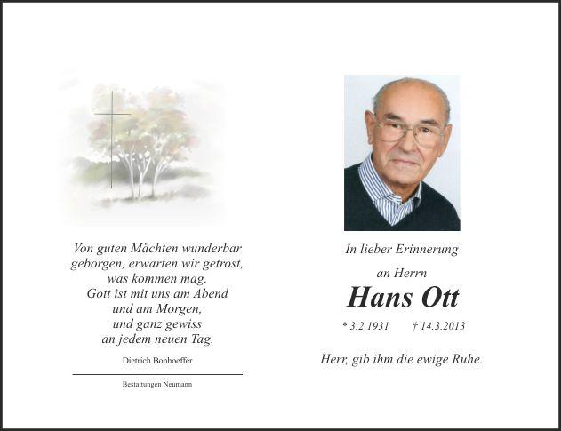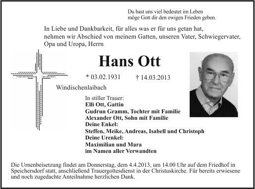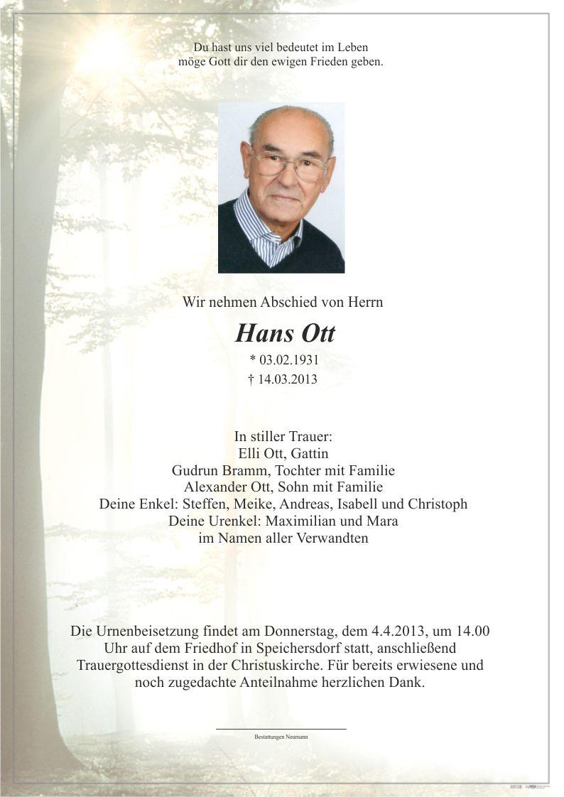 Die Urnenbeisetzung findet am Donnerstag dem 4.4.2013, um 14.00 Uhr auf dem Friedhof in Speichersdorf statt, anschließend Trauergottesdienst in der Christuskirche. Für bereits erwiesene und noch zugedachte Anteilnahme herzlichen Dank.