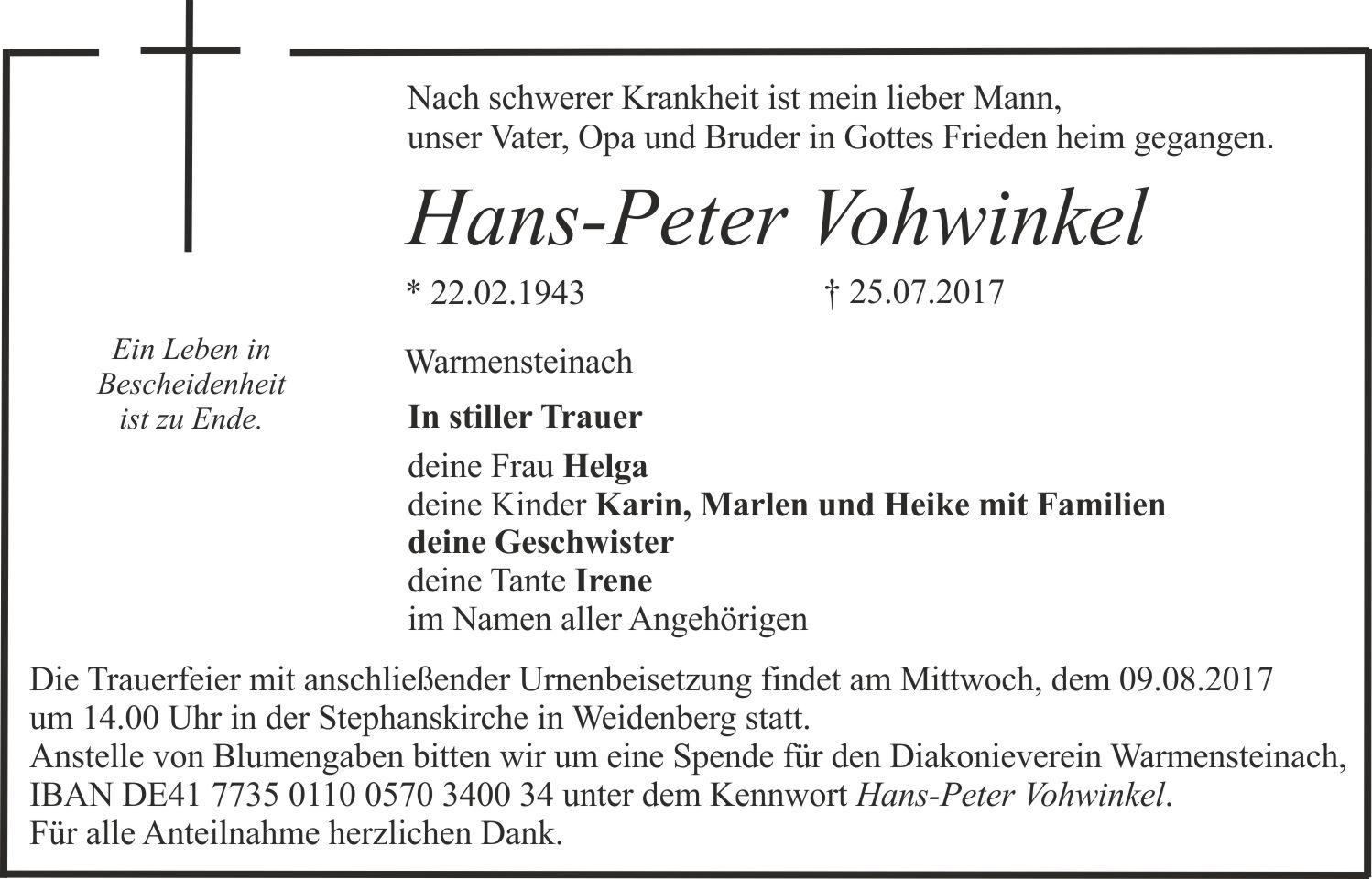 Der Trauergottesdienst findet am 09.08.2017, um 14.00 Uhr in der Stephanskirche in Weidenberg statt, anschließenden Urnenbeisetzung im Friedhof Weidenberg. Für alle Anteilnahme herzlichen Dank.