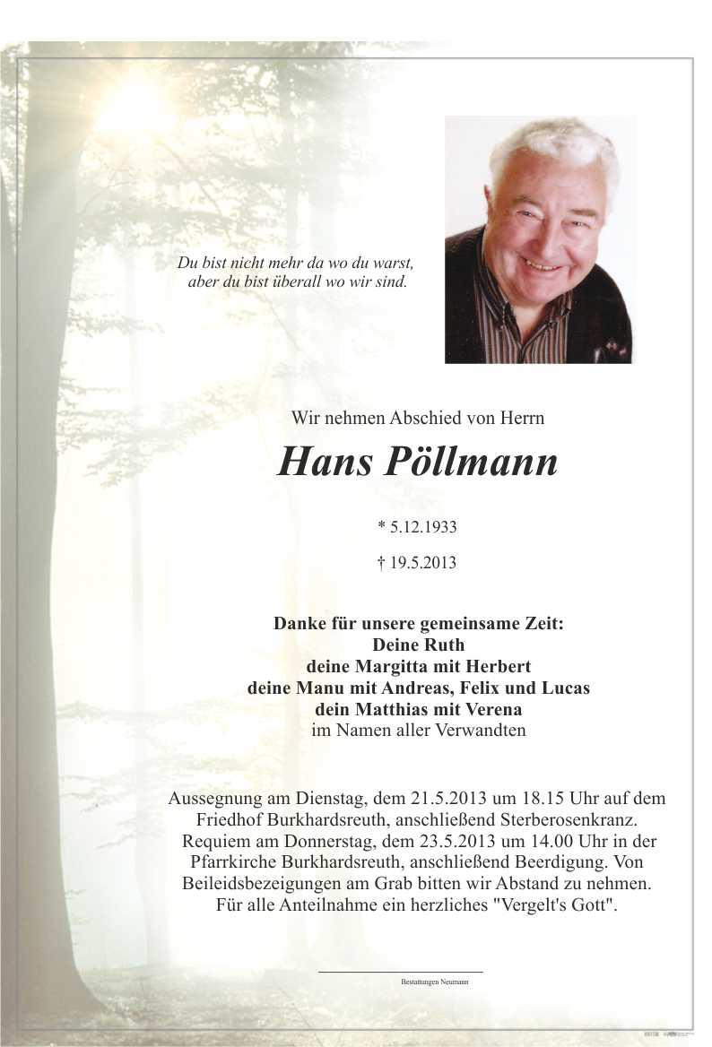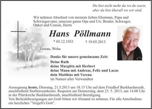 Aussegnung am Dienstag, 21.5.2013 um 18.15 Uhr auf dem Friedhof Burkhardsreuth, anschließend Sterberosenkranz. Requiem am Donnerstag, dem 23. 5. 2013, um 14.00 Uhr in der Pfarrkirche Burkhardsreuth, anschließend Beerdigung.