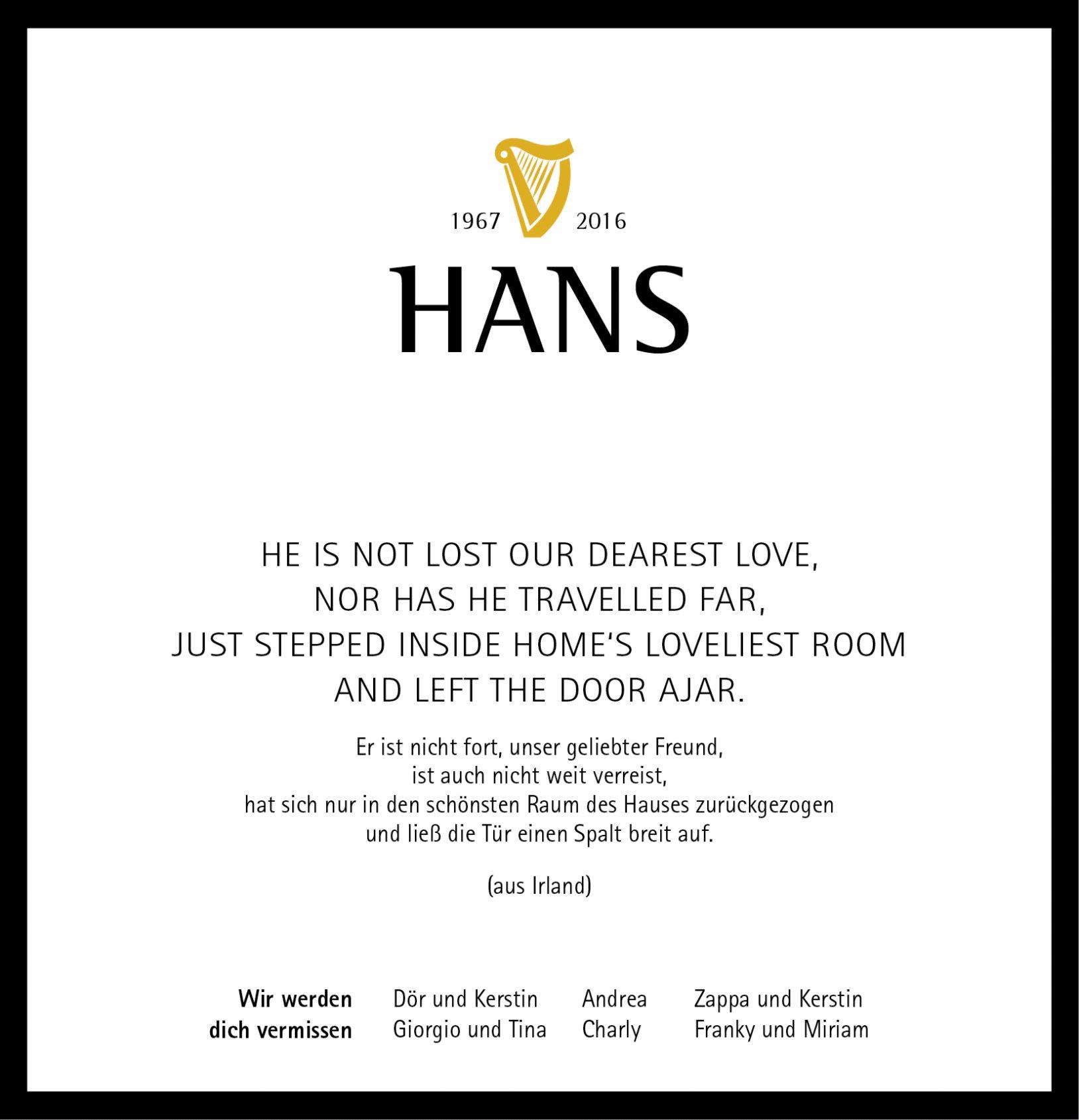 Und Hans, mein Lieber. Wir werden weiter da sein. In deinem Gedenken. In unseren Wünschen mit ganz viel Lachen und bitteren Tränen.