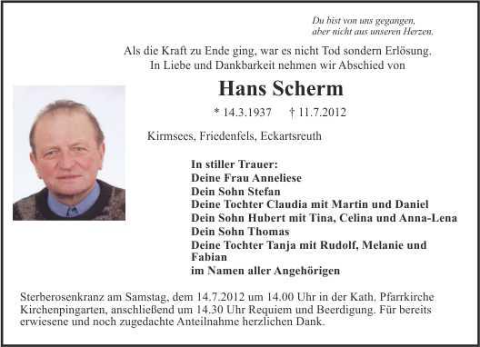 Sterberosenkranz am Samstag, dem 14.7.2012 um 14.00 Uhr in der Kath. Pfarrkirche Kirchenpingarten, anschließend um 14.30 Uhr Requiem und Beerdigung. Für bereits erwiesene und noch zugedachte Anteilnahme herzlichen Dank.