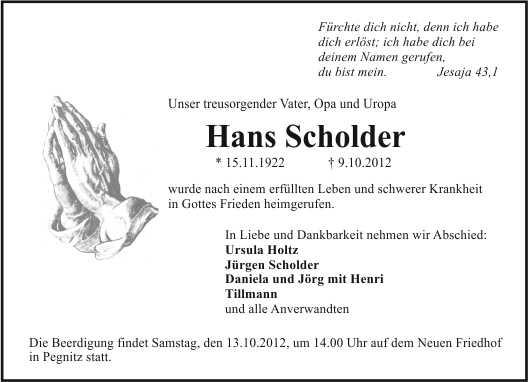 Die Beerdigung findet am Samstag, dem 13.10.2012, um 14.00 Uhr auf dem Neuen Friedhof Pegnitz statt.