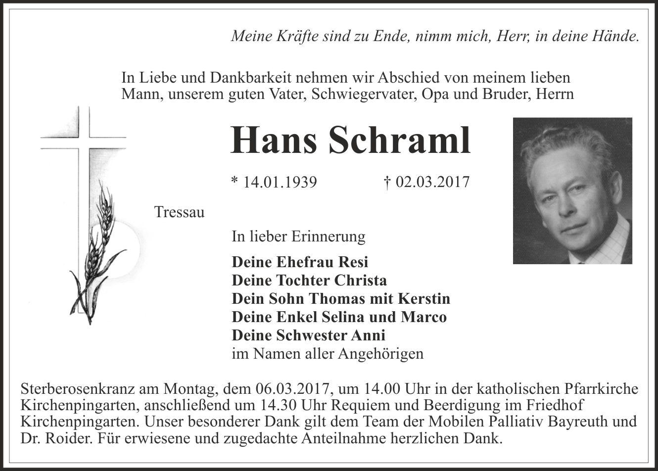 Sterberosenkranz am Montag, dem 06.03.2017, um 14.00 Uhr in der katholischen Pfarrkirche Kirchenpingarten, anschließend um 14.30 Uhr Requiem und Beerdigung im Friedhof Kirchenpingarten. Für erwiesene und zugedachte Anteilnahme herzlichen Dank.