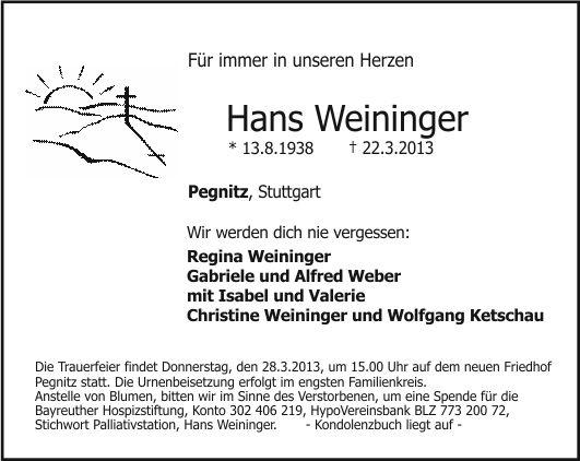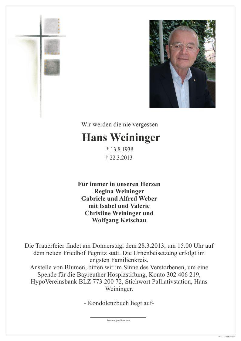 Anstelle von Blumen, bitten wir im Sinne des Verstorbenen, um eine Spende für die Bayreuther Hospizstiftung, Konto 302 406 219, HypoVereinsbank BLZ 773 200 72, Stichwort Palliativstation, Hans Weininger. - Kondolenzbuch liegt auf -