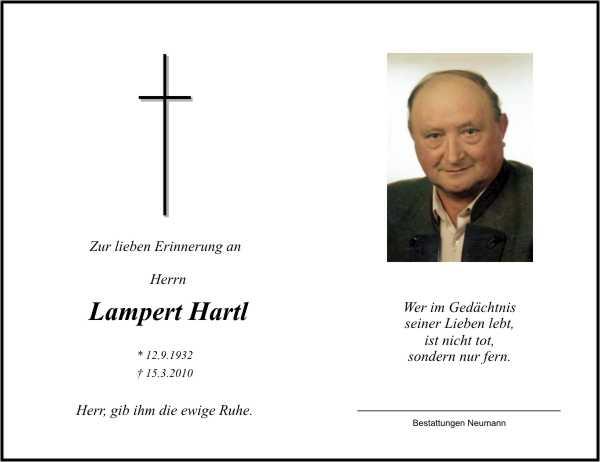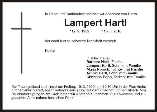 Die Beisetzung findet am Freitag, 19.03.2010 um 14:30 Uhr auf dem Friedhof in Kirchenlaibach statt.