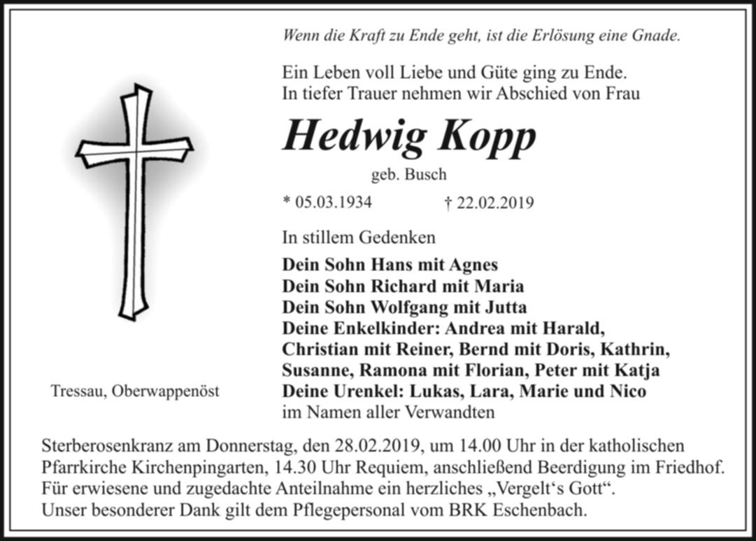 Der Sterberosenkranz findet am Donnerstag, dem 28.02.2019, um 14.00 Uhr in der katholischen Pfarrkirche Kirchenpingarten statt, anschließend um 14.30 Uhr Requiem und Beerdigung. Für aller Anteilnahme ein herzliches " Vergelt's Gott."