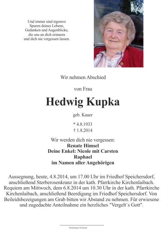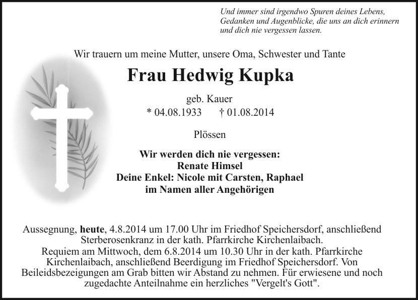 Aussegnung, heute, 4.8.2014 um 17.00 Uhr im Friedhof Speichersdorf, anschließend Sterberosenkranz in der kath. Pfarrkirche Kirchenlaibach.
