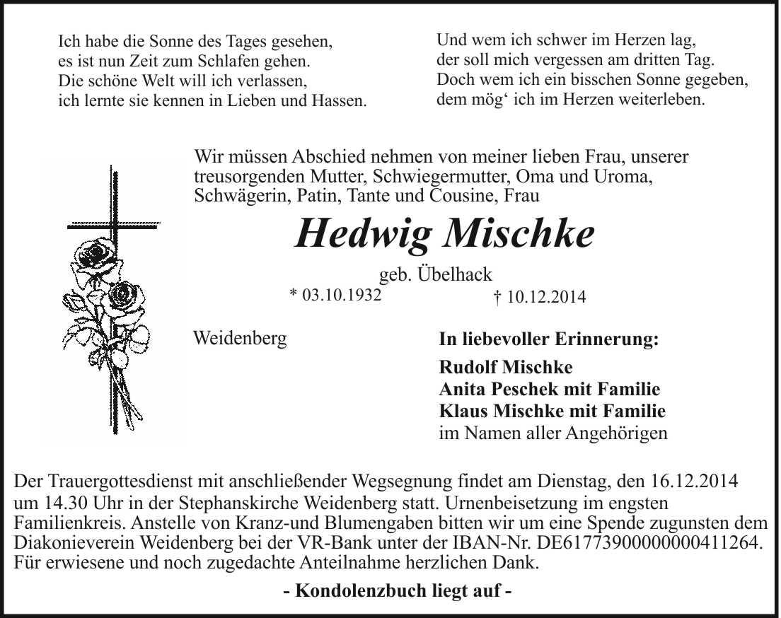 um 14.30 Uhr in der Stephanskirche Weidenberg statt. Urnenbeisetzung im engsten Familienkreis. Anstelle von Kranz-und Blumengaben bitten wir um eine Spende zugunsten dem Diakonieverein Weidenberg bei der VR-Bank unter der IBAN-Nr. DE61773900000000411264. Für erwiesene und noch zugedachte Anteilnahme herzlichen Dank.
