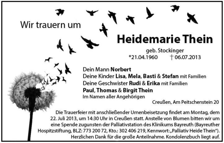 Der Trauergottesdienst findet am Montag, dem 22.7.2013 um 14.30 Uhr auf dem Friedhof Creußen statt, anschließend Urnenbeisetzung.