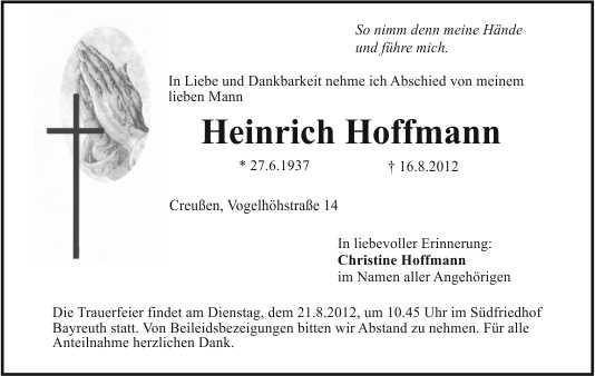 Bayreuth statt. Von Beileidsbezeigungen bitten wir Abstand zu nehmen. Für alle Anteilnahme herzlichen Dank.