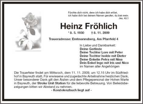 Die Trauerfeier findet am Mittwoch dem 11.11.2009 um 12.15 Uhr im Südfriedhof in Bayreuth statt.