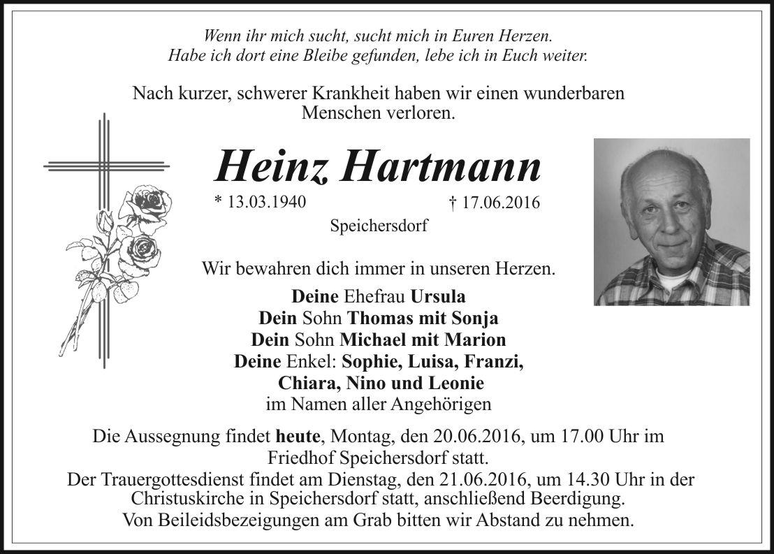 Der Trauergottesdienst findet am Dienstag, den 21.06.2016, um 14.30 Uhr in der Christuskirche in Speichersdorf statt, anschließend Beerdigung.