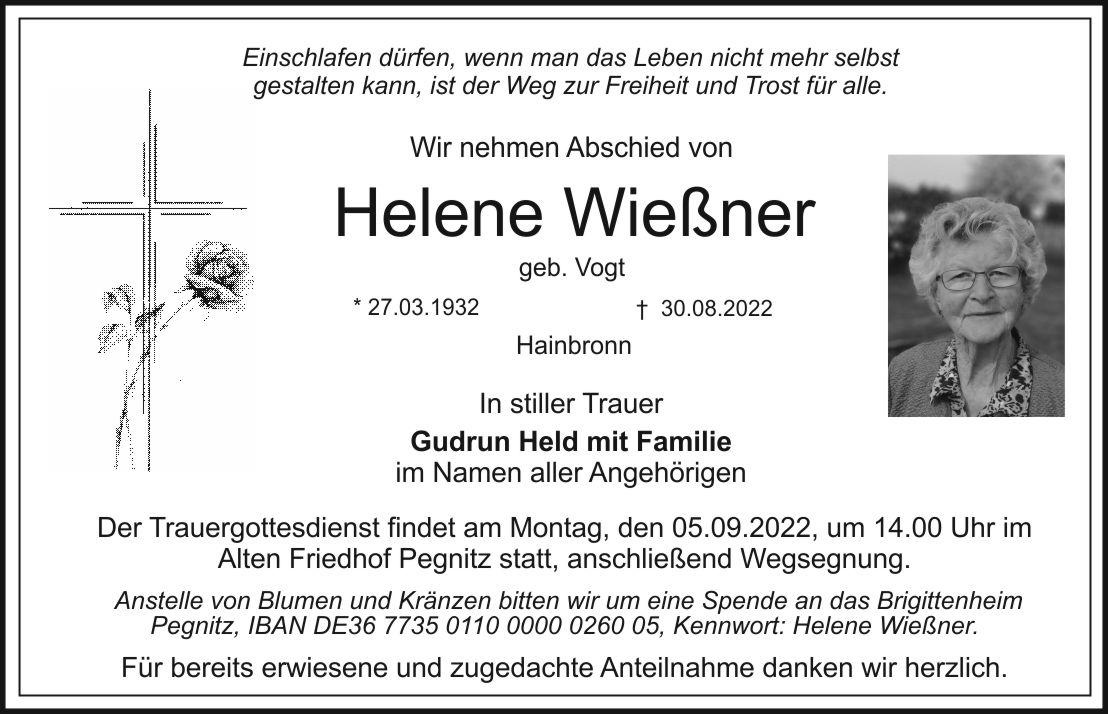 Anstelle von Blumen und Kränzen bitten wir um eine Spende an das Brigittenheim Pegnitz, IBAN DE36 7735 0110 0000 0260 05, Kennwort: Helene Wießner.