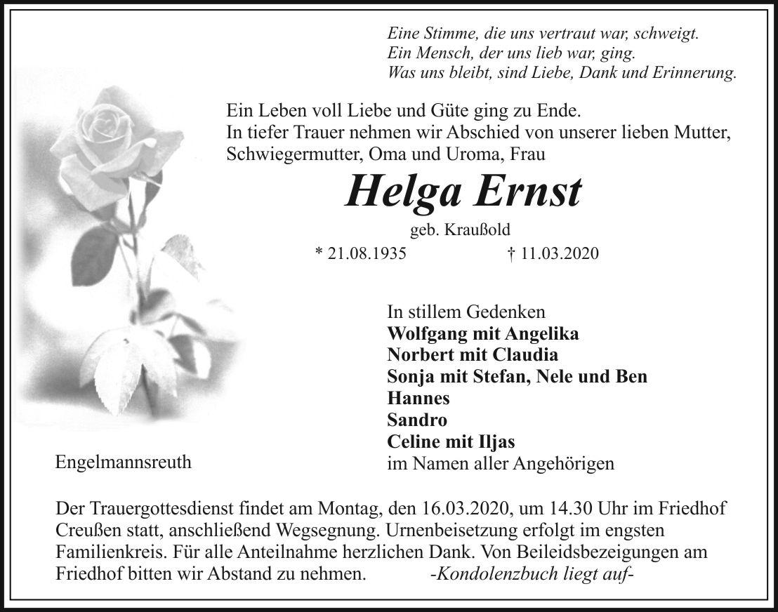Der Trauergottesdienst findet am Montag, den 16.03.2020, um 14.30 Uhr im Friedhof Creußen statt, anschließend Wegsegnung. Urnenbeisetzung erfolgt im engsten Familienkreis. Für alle Anteilnahme herzlichen Dank. Von Beileidsbezeigungen am Friedhof bitten wir Abstand zu nehmen.