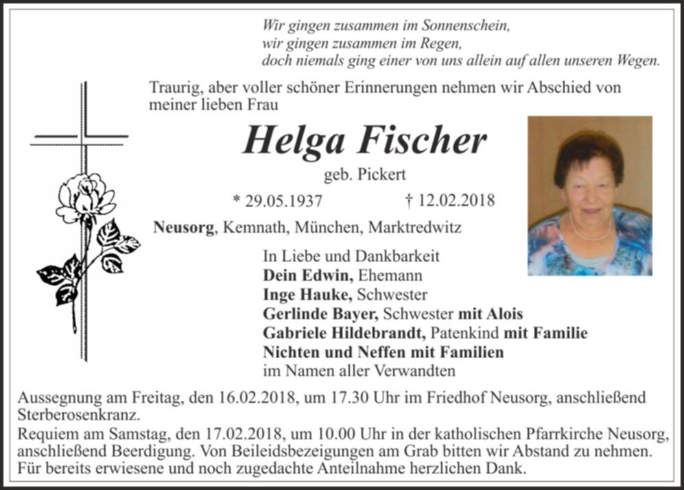 Aussegnung am Freitag, den 16.02.2018, um 17.30 Uhr im Friedhof Neusorg, anschließend Sterberosenkranz. Requiem am Samstag, den 17.02.2018, um 10.00 Uhr in der katholischen Pfarrkirche Neusorg, anschließend Beerdigung. Von Beileidsbezeigungen am Grab bitten wir Abstand zu nehmen. Für bereits erwiesene und noch zugedachte Anteilnahme herzlichen Dank.