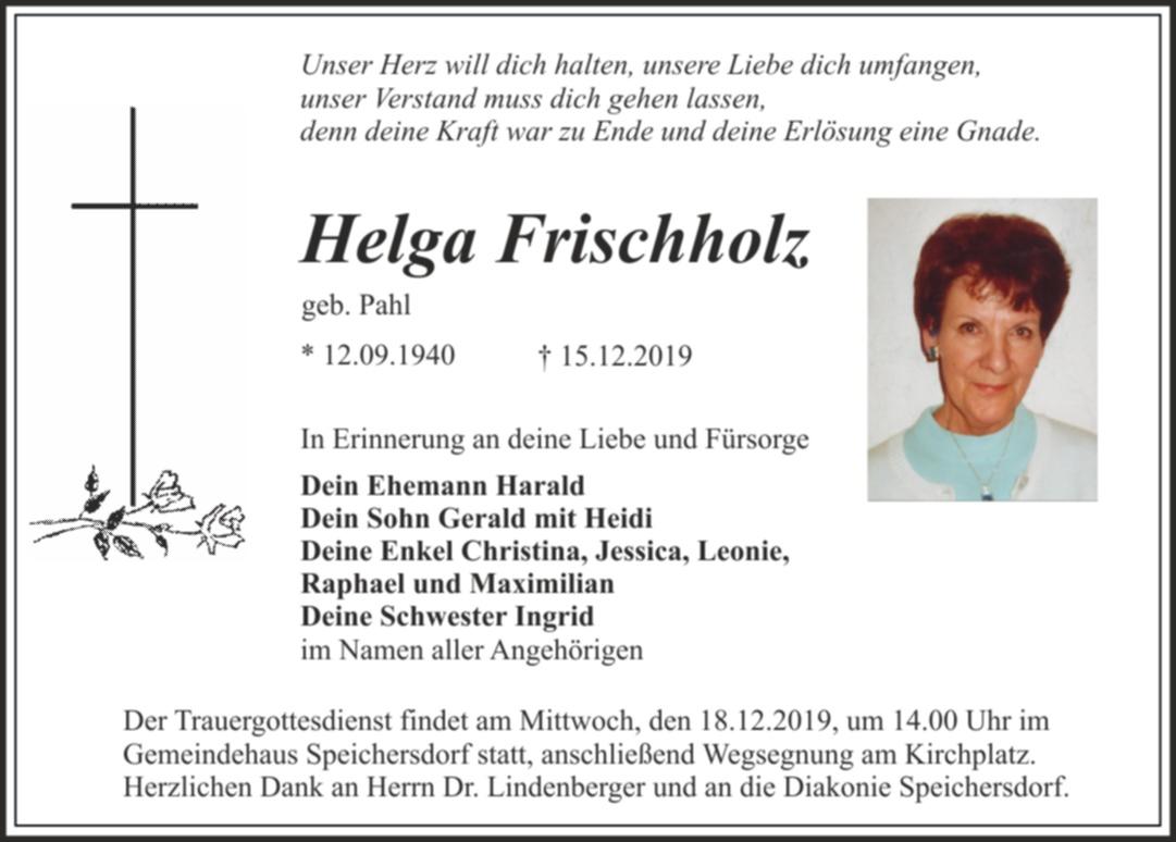 Der Trauergottesdienst findet am Mittwoch, den 18.12.2019, um 14.00 Uhr im Gemeindehaus Speichersdorf statt, anschließend Wegsegnung am Kirchplatz.