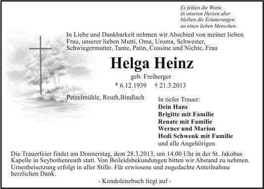 Die Trauerfeier findet am Donnerstag, dem 28.3.2013, um 14.00 Uhr in der St. Jakobus Kapelle in Seybothenreuth statt. Von Beileidsbekundungen bitten wir Abstand zu nehmen. Urnenbeisetzung erfolgt in aller Stille. Für erwiesene und zugedachte Anteilnahme herzlichen Dank.