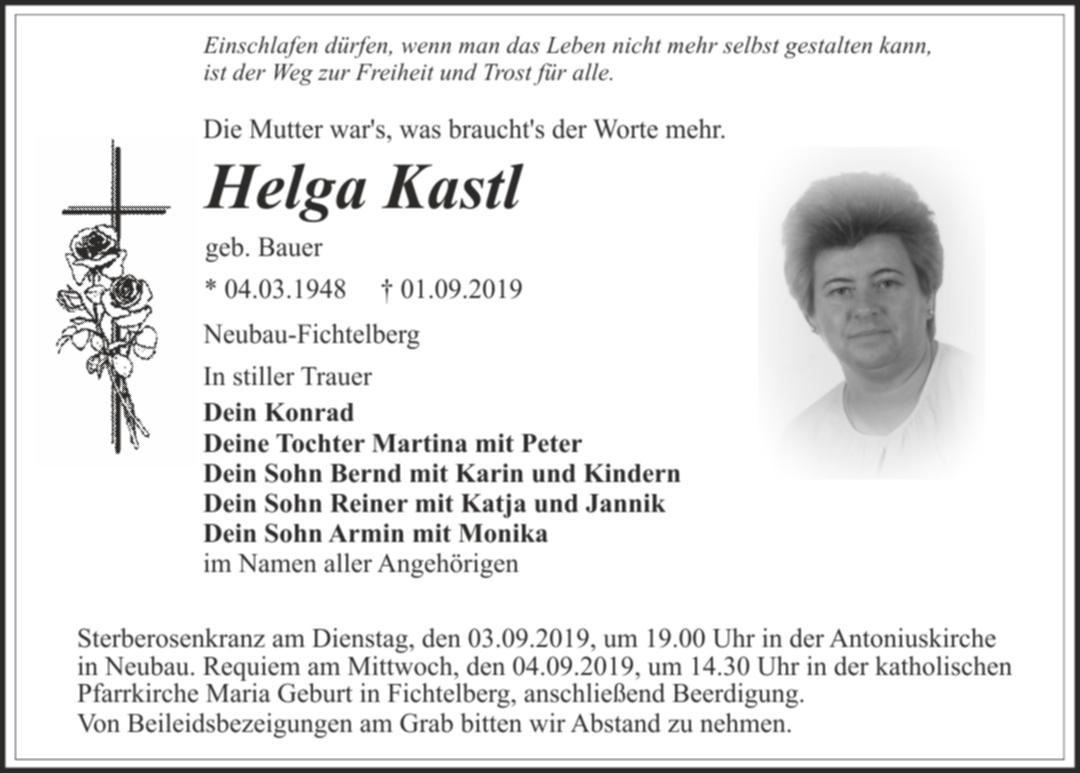 Sterberosenkranz am Dienstag, den 03.09.2019, um 19.00 Uhr in der Antoniuskirche in Neubau. Requiem am Mittwoch, den 04.09.2019, um 14.30 Uhr in der katholischen Pfarrkirche Maria Geburt in Fichtelberg, anschließend Beerdigung.