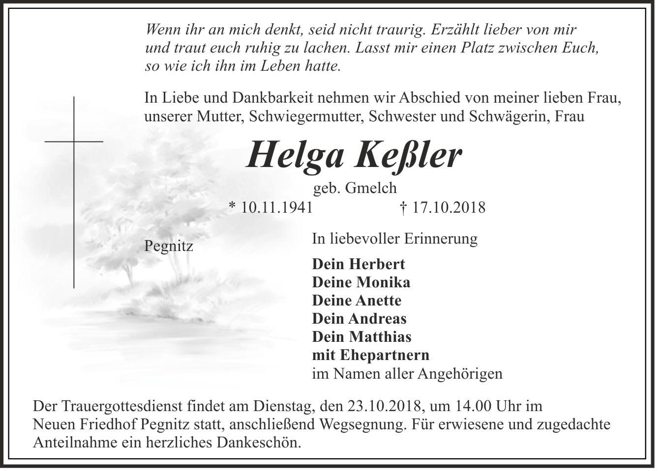 Der Trauergottesdienst findet am Dienstag, dem 23.10.2018, um 14.00 Uhr im neuen Friedhof Pegnitz statt, anschließend Wegsegnung. Für alle Anteilnahme herzlichen Dank.