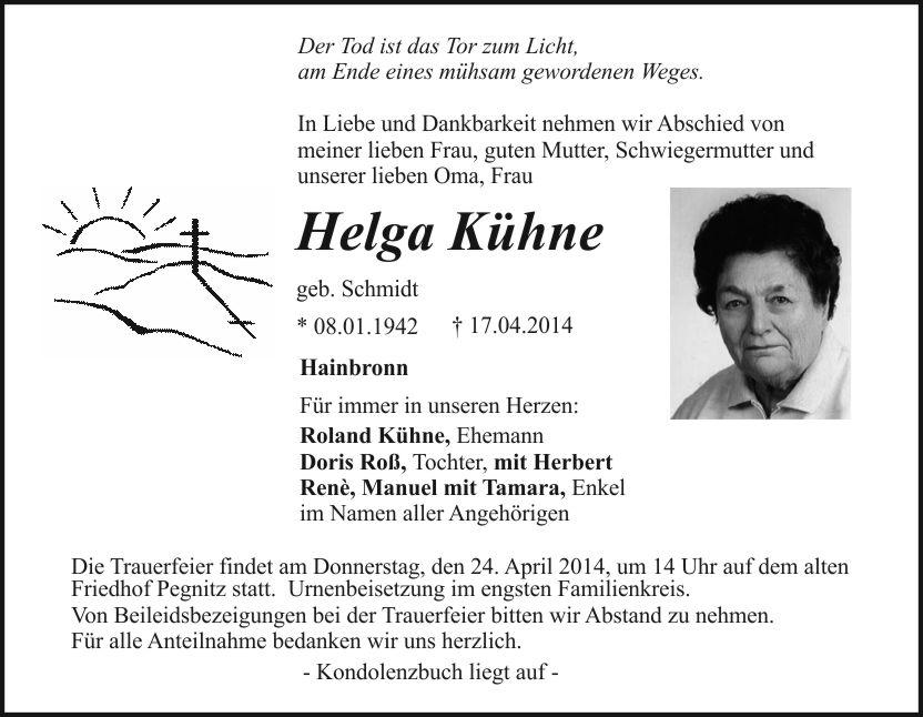 Die Trauerfeier findet am Donnerstag, den 24. April 2014, um 14 Uhr auf dem alten Friedhof Pegnitz statt. Urnenbeisetzung im engsten Familienkreis.