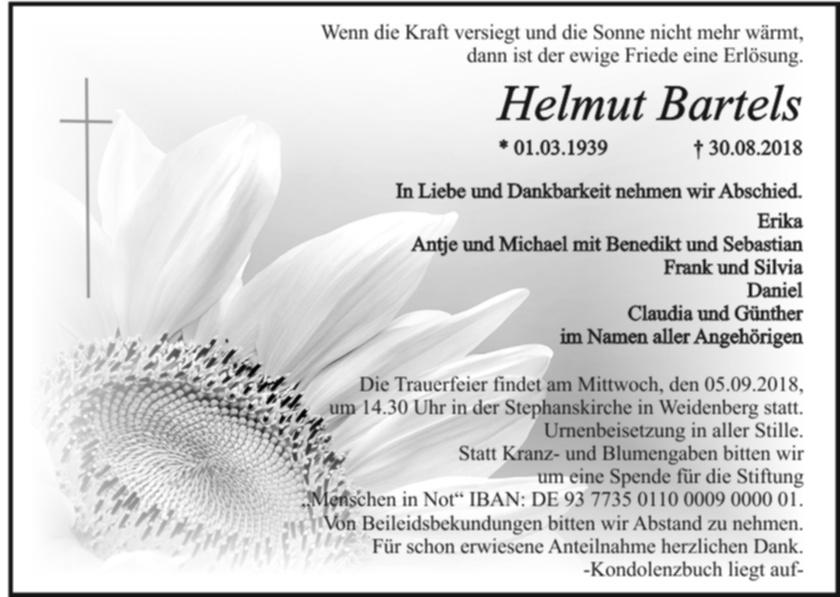 Der Trauergottesdienst findet am Mittwoch, den 05.09.2018, um 14.30 Uhr in der Stephans Kirche Weidenberg statt. Urnenbeisetzung im engsten Familienkreis. Für alle Anteilnahme herzlichenn Dank.