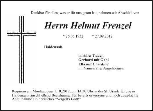 Requiem am Montag, dem 1.10.2012, um 14.30 Uhr in der St. Ursula Kirche in Haidenaab, anschließend Beerdigung. Für bereits erwiesene und noch zugedachte Anteilnahme ein herzliches "Vergelt's Gott!"
