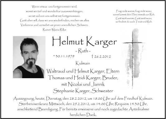Den Angehörigen wie Eltern, Geschwister, Freundin spreche ich mein tiefstes Beileid aus. Im stillen Gebet widme ihnen allzeit Kraft, Lebensmut und Hoffnung!