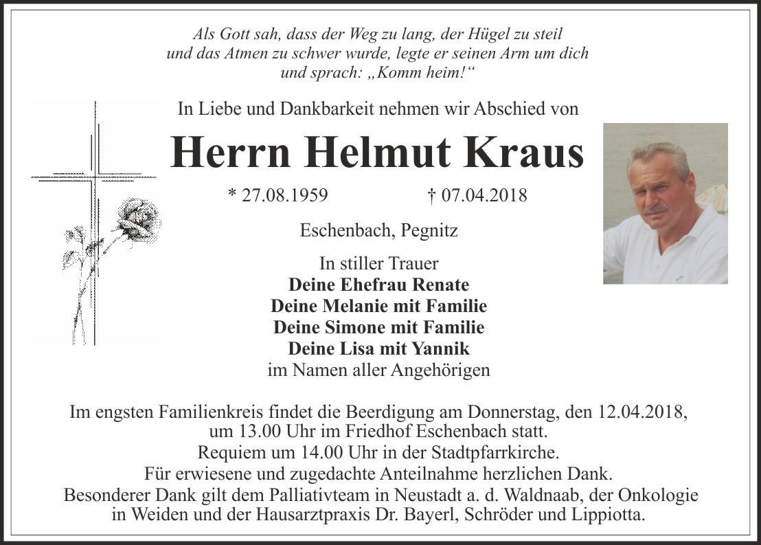 Im engsten Familienkreis findet die Beerdigung am Donnerstag, den 12.04.2018, um 13.00 Uhr im Friedhof Eschenbach statt.
