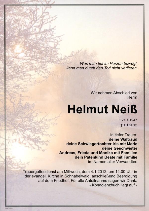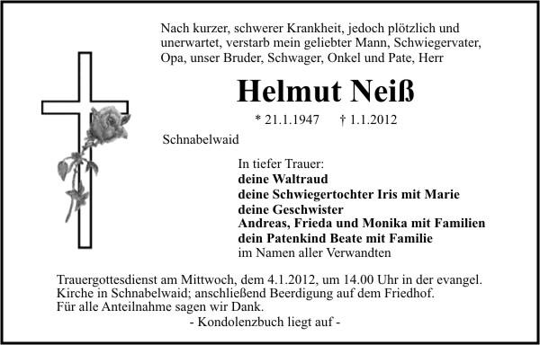 Trauergottesdienst am Mittwoch, dem 4.1.2012, um 14.00 Uhr in der evangel. Kirche in Schnabelwaid; anschließend Beerdigung auf dem Friedhof.