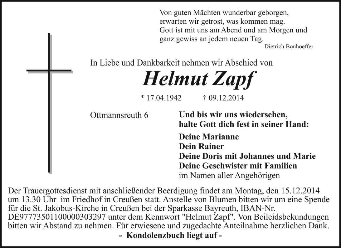 Der Trauergottesdienst mit anschließender Beerdigung findet am Montag, den 15.12.2014 um 13.30 Uhr im Friedhof in Creußen statt. Anstelle von Blumen bitten wir um eine Spende für die St. Jakobus-Kirche in Creußen bei der Sparkasse Bayreuth, IBAN-Nr. DE97773501100000303297 unter dem Kennwort "Helmut Zapf". Von Beileidsbekundungen bitten wir Abstand zu nehmen. Für erwiesene und zugedachte Anteilnahme herzlichen Dank.