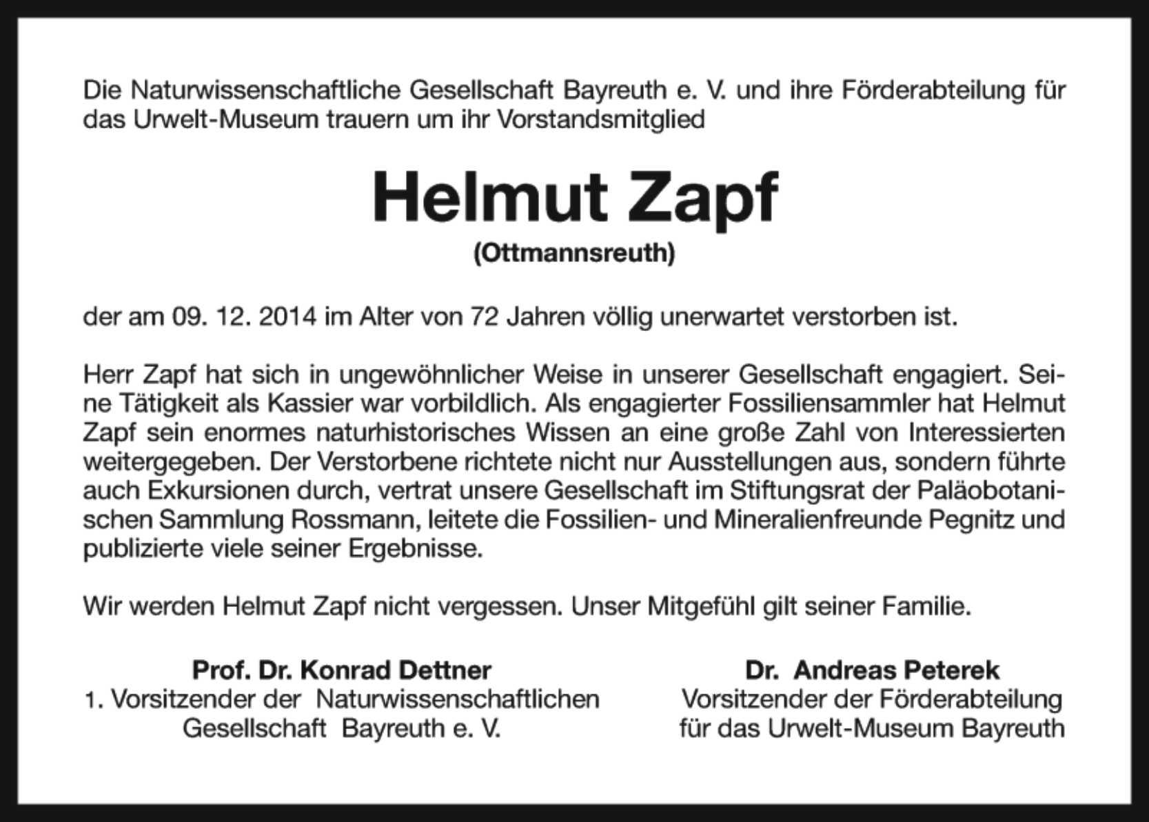 ich möchte Ihnen mein aufrichtiges Beileid aussprechen. Ich kannte Herrn Zapf als einen heimatverbundenen Geologen, dessen Arbeiten mir in Erinnerung bleiben werden.