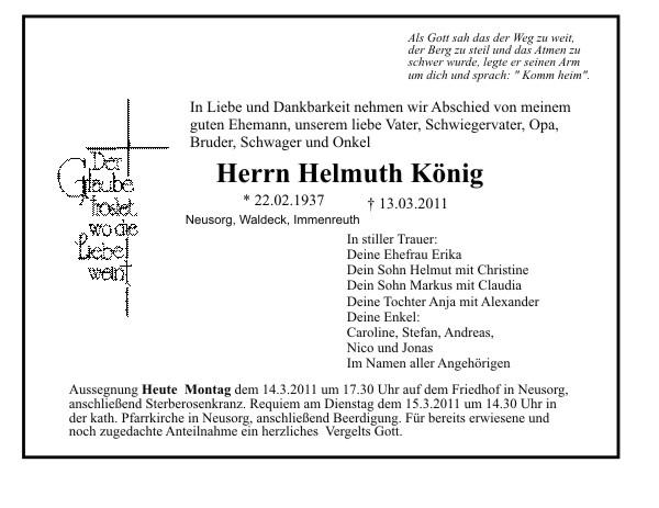 Die Beisetzung findet am Dienstag, 15.03.2011 um 14:30 Uhr auf dem Friedhof in Neusorg statt.