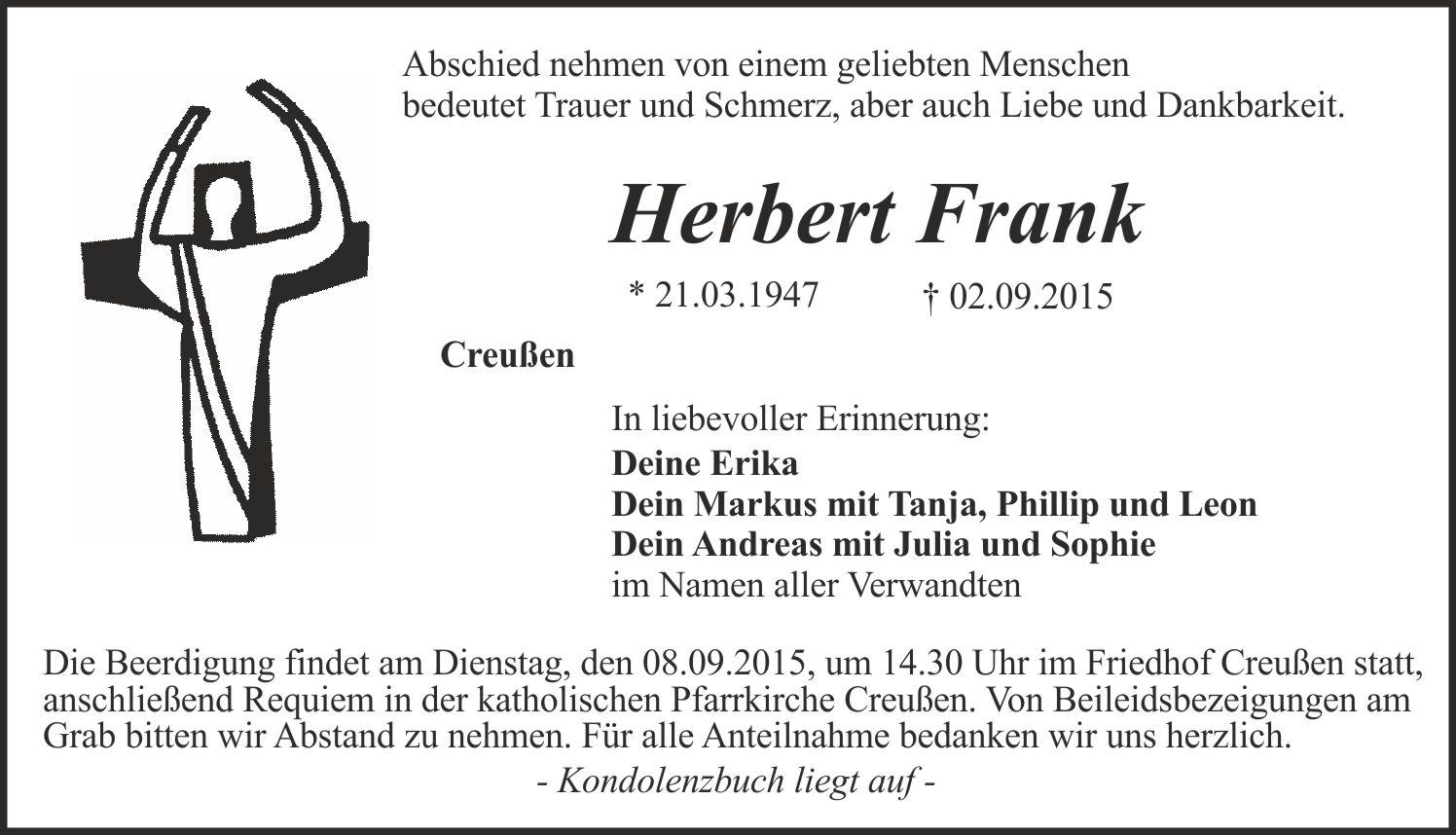 Die Beerdigung findet am Dienstag, den 08.09.2015, um 14.30 Uhr im Friedhof Creußen statt, anschließend Requiem in der katholischen Pfarrkirche in Creußen. Von Beileidsbezeigungen am Grab bitten wir Abstand zu nehmen. Für alle Anteilnahme herzlichen dank. - Kondolenzbuch liegt auf -