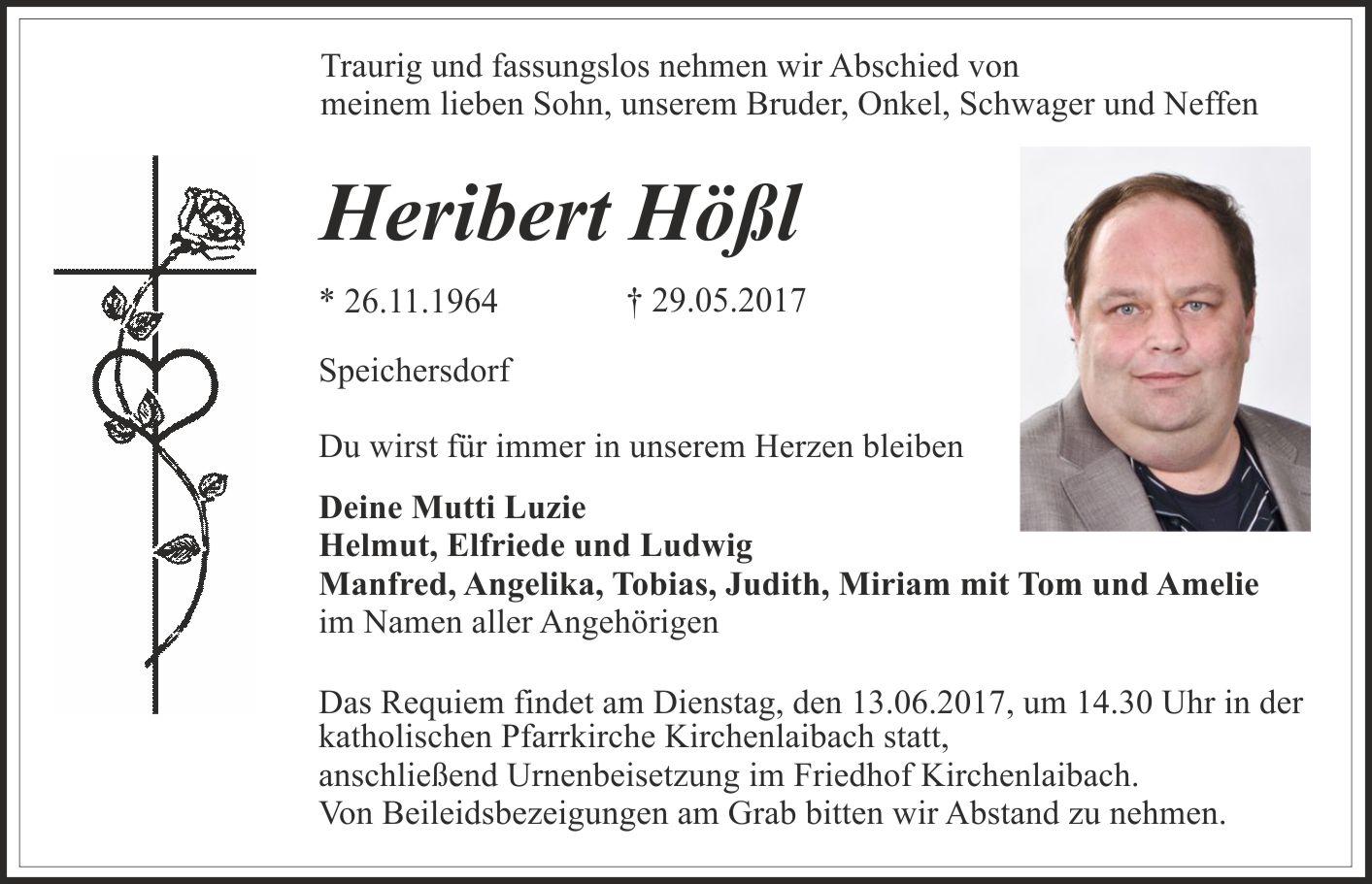 Das Requiem findet am Dienstag, den 13.06.2017, um 14.30 Uhr in der katholischen Pfarrkirche Kirchenlaibach statt, anschließend Urnenbeisetzung im Friedhof Kirchenlaibach. Für alle Anteilnahme herzlichen Dank.