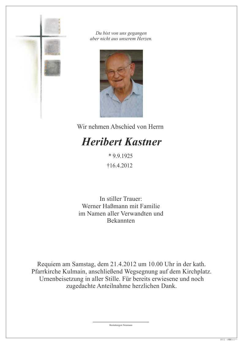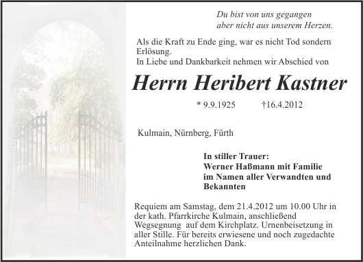 Requiem am Samstag, dem 21.4.2012 um 10.00 Uhr in der kath. Pfarrkirche Kulmain, anschließend Wegsegnung auf dem Kirchplatz. Urnenbeisetzung in aller Stille. Für bereits erwiesene und noch zugedachte Anteilnahme herzlichen Dank.