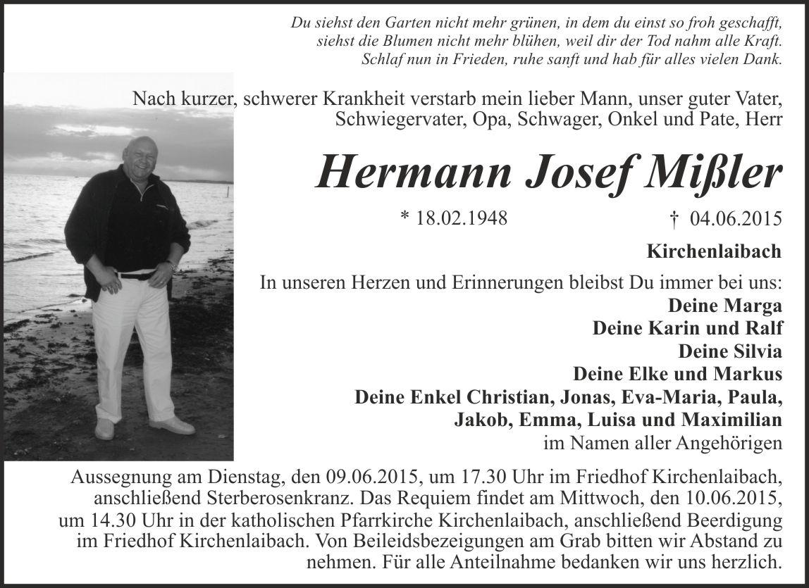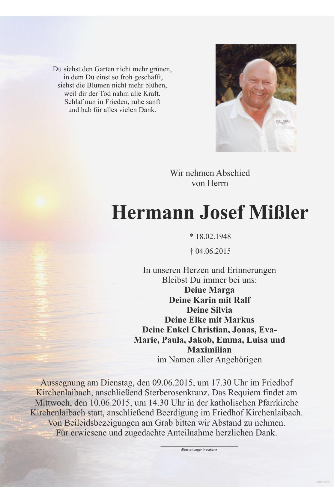 Aussegnung am Dienstag, den 09.06.2015, um 17.30 Uhr im Friedhof Kirchenlaibach, anschließend Sterberosenkranz. Requiem am Mittwoch, den 10.06.2015, um 14.30 Uhr in der katholischen Pfarrkirche Kirchenlaibach, anschließend Beerdigung im Friedhof Kirchenlaibach. Für alle Anteilnahme bedanken wir uns herzlich.