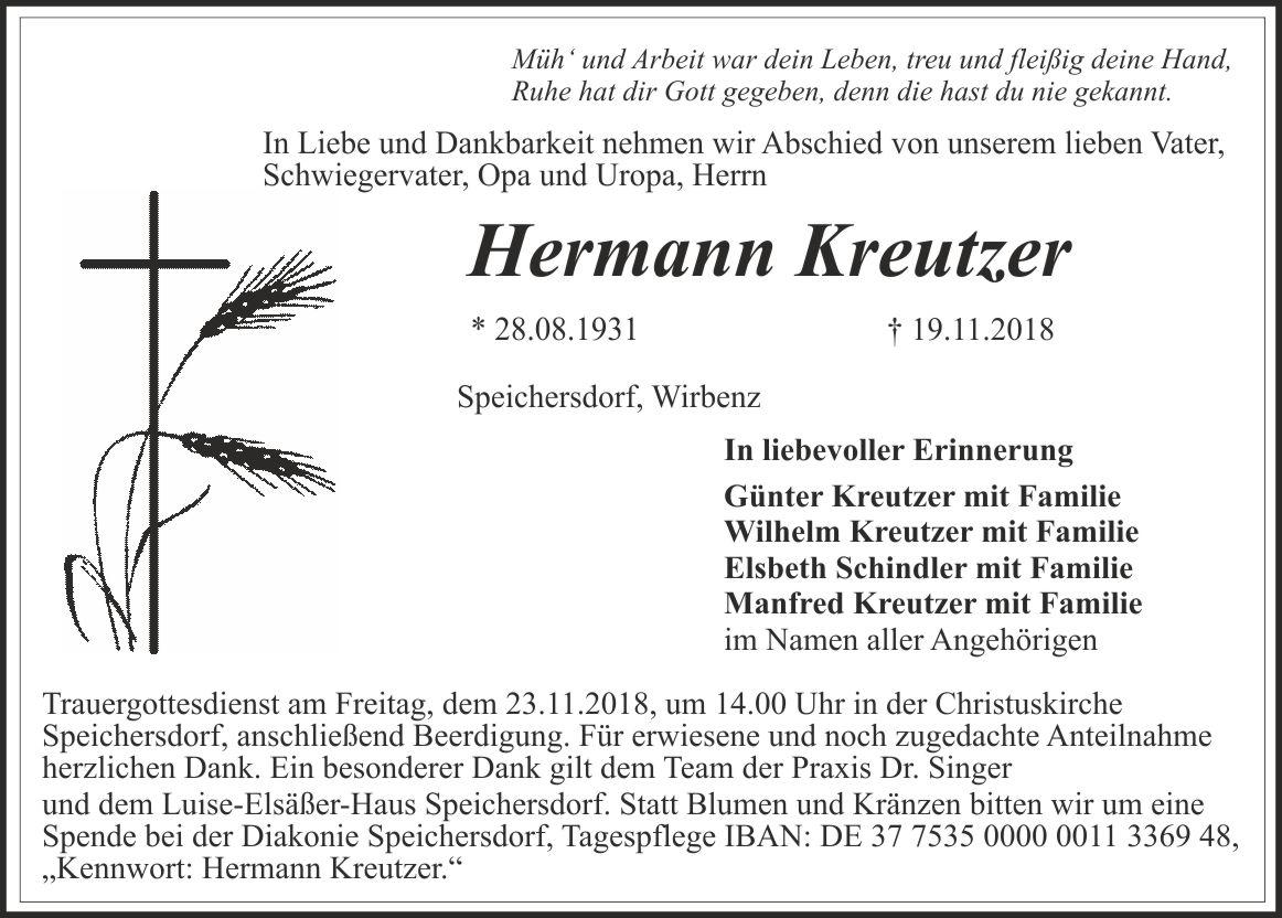 Der Trauergottesdienst findet am Freitag, dem 23.11.2018, um 14.00 Uhr in der evangelischen Christuskirche Speichersdorf statt, anschließend Beerdigung im Friedhof Speichersdorf. Für alle Anteilnahme herzlichen Dank.