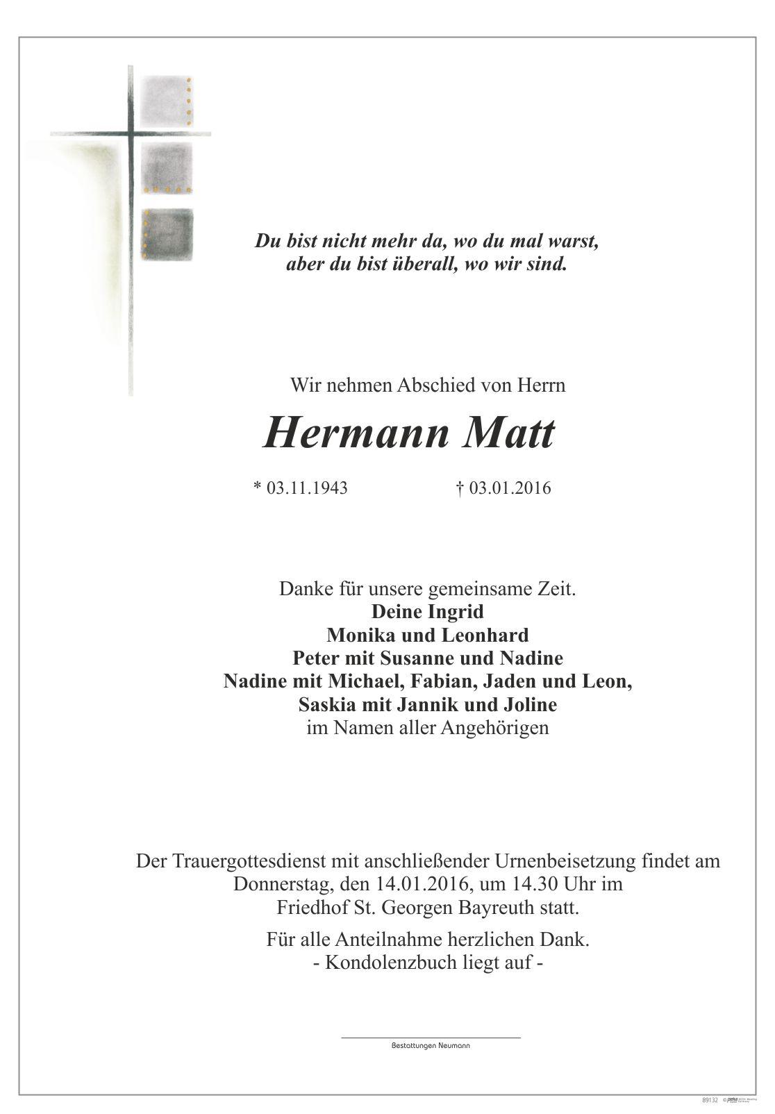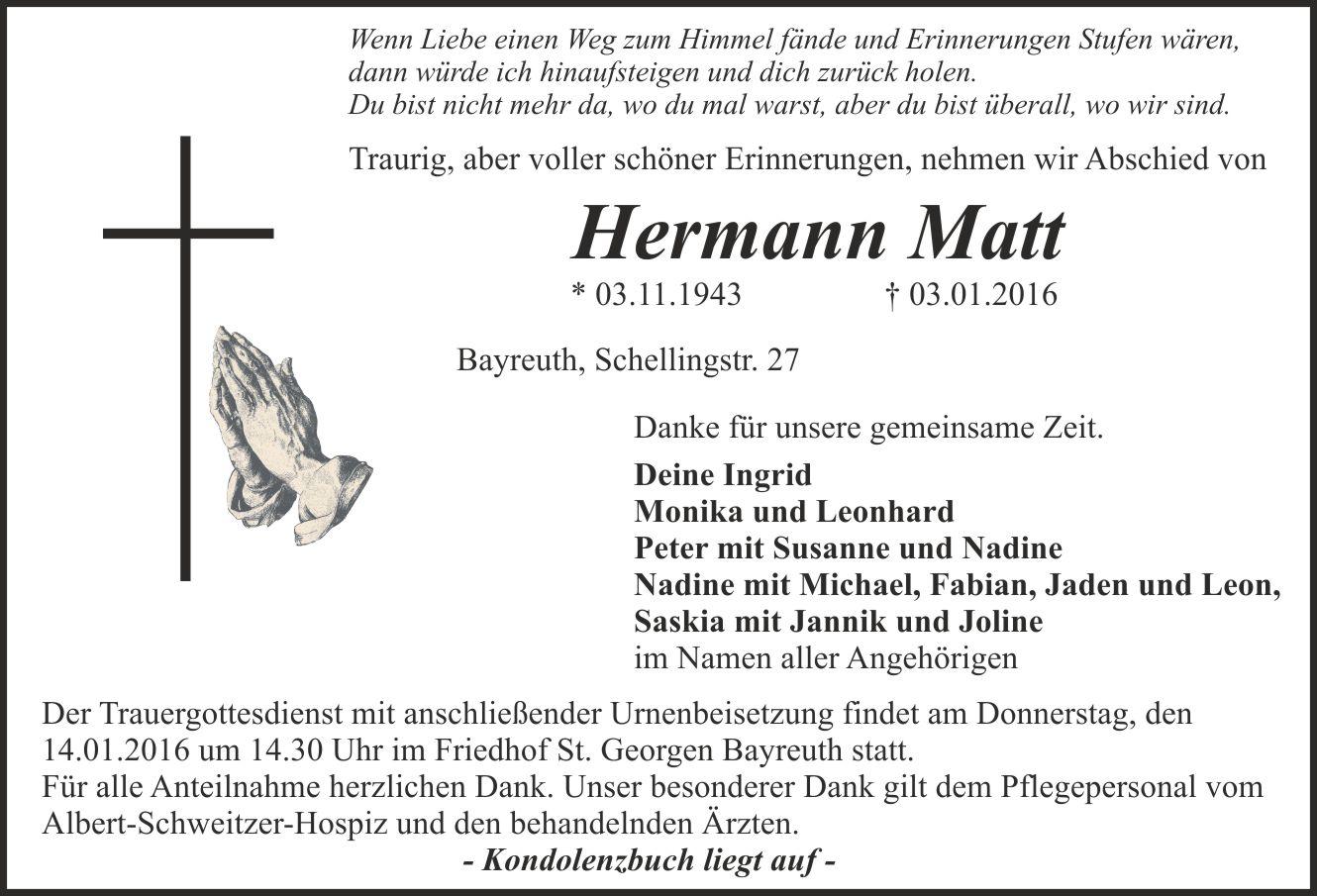 Der Trauergottesdienst mit anschließender Urnenbeisetzung findet am Donnerstag, den 14.01.2016 um 14.30 Uhr im Friedhof St. Georgen Bayreuth statt.