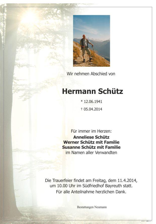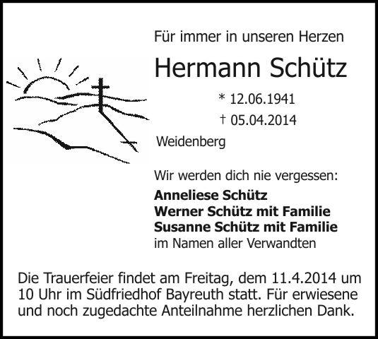 Die Trauerfeier findet am Freitag, dem 11.4.2014 um 10 Uhr im Südfriedhof Bayreuth statt. Für erwiesene und noch zugedachte Anteilnahme herzlichen Dank.